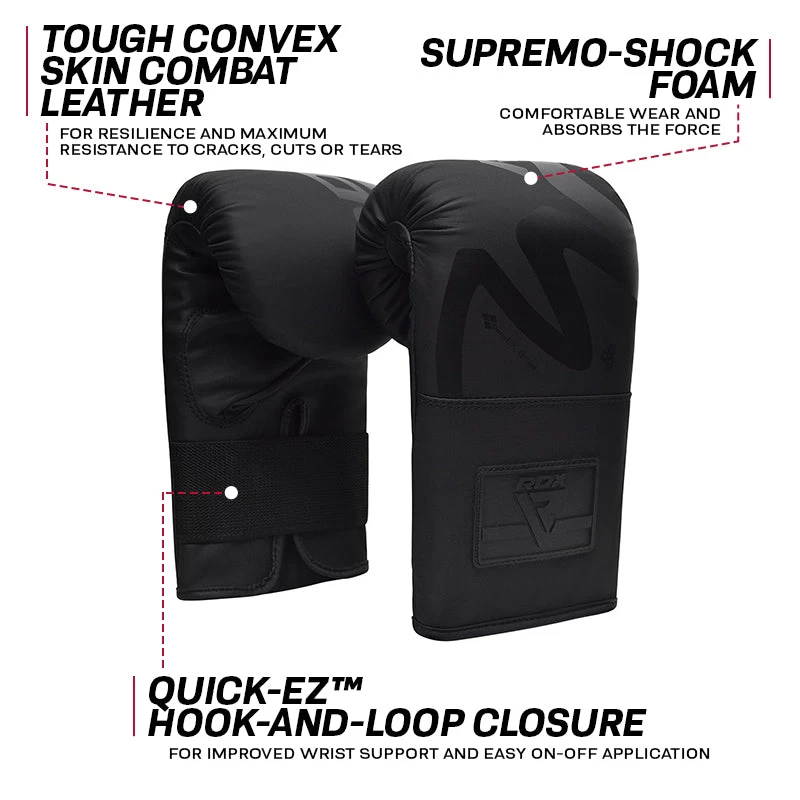 Striking aesthetics and indestructible build, the RDX Sports bag gloves are the ultimate choice for stay-at-home boxers or boxfit enthusiasts. Layered with ultra-durable ConvEX Skin combat leather casing, these boxing mitts offer comfortable wear and lasting performance blow after blow, session after session.Pre-curved design minimizes hand fatigue while high-impact resistant foam offers unbeatable protection against hand injuries or bruised knuckles. Strategically placed pinholes promote airflow to keep your hands cool and sweat-free during longer sessions. Elasticated Hook-and-Loop closure ensures a secure fit while you’re moving around or throwing punches, and provides ample wrist support for heavy-bag workouts.