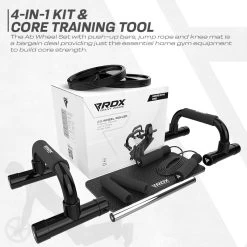 - 4-IN-1 KIT & CORE TRAINING TOOL The Ab Wheel Set with push-up bars, jump rope and knee mat is a bargain deal providing just the essential home gym equipment to build core strength, reduce risk of muscular injury, burn calories and attain a trimmed physique. Our home workout gear helps you stretch and exercise muscles in the back, shoulder, chest, and arms abdomen so you can achieve visible abs.
