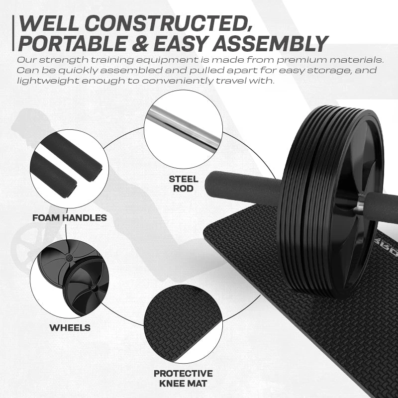 - STABLE AB ROLLER & PROTECTIVE KNEE MAT Ultra-wide ab wheel roller for core workout provides increased stability during home gym workouts, with a 660 lbs strong bearing capacity. Long, durable handle with soft foam grip minimizes hand fatigue for increased comfort. Non-slip TPR rubber ab wheel does not slide during exercise providing controlled movement. Comes with a thicker foam knee mat to protect knees.