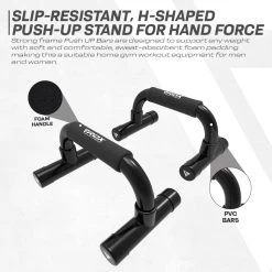 - SLIP-RESISTANT, H-SHAPED PUSH-UP STAND FOR HAND FORCE Strong frame Push UP Bars are designed to support any weight with soft and comfortable, sweat-absorbent foam padding making this a suitable home gym workout equipment for men and women. The ergonomical design push up stand prevents skidding, reducing risk of you getting hurt and is great for enhancing grip, upper body strength training workouts.