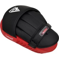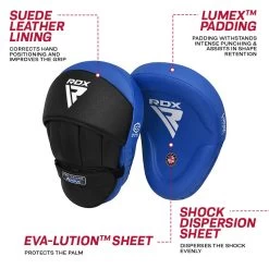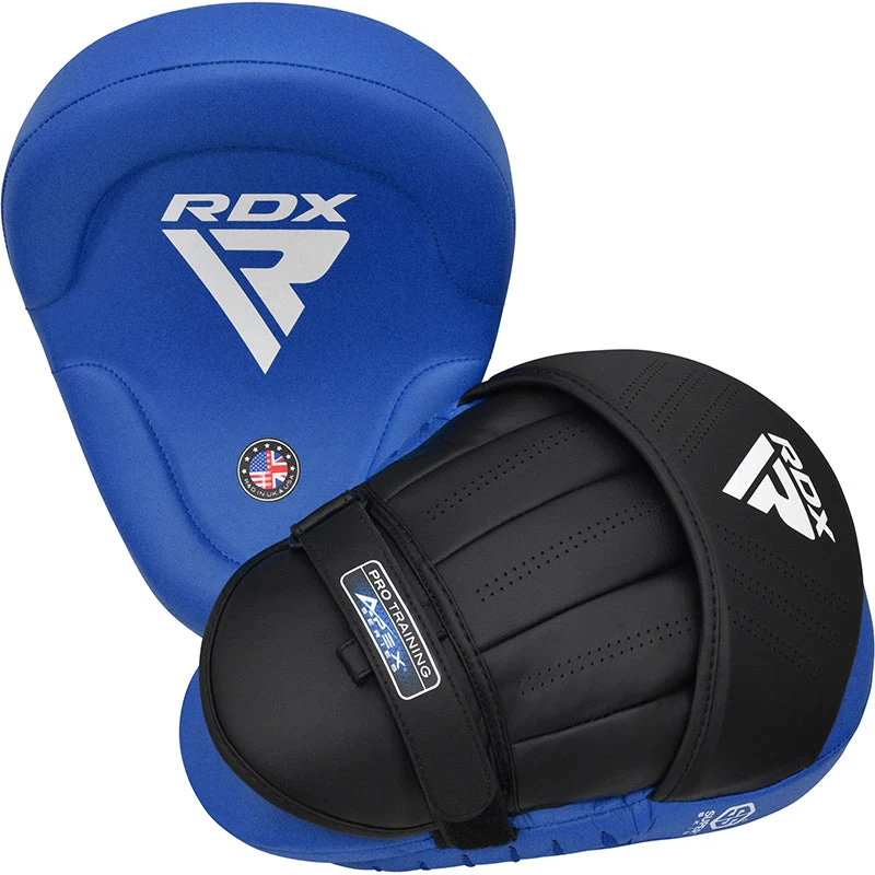 Train to give your best performance with the APEX focus pads by RDX. Designed with LumeXTM padding technology to handle intense punching during grueling practice sessions. Super skin engineered leather used on the outer surface makes these pads for boxing wear and tear resistant and helps to retain the original shape. The ergonomic palm dome design with grip ball assists in handling heavy strikes during MMA and boxing training.Suede leather lining on top of the grip ball corrects the hand positioning and allows a firm grip during focus pad training. Spongy Blacktop Fabric at knuckles creates a comfortable environment for the hand. Compressed EVA-LUTIONTM SHEET in the front and infused shock dispersion sheet at the back provide shock resistance and adequate protection to the palm and hand. Sides covered with SpongeX padding leave no room for hand fatigue and injuries in the RDX focus mitts.