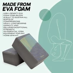 - MADE FROM EVA FOAM High-density EVA Foam yoga block is built to sustain all sorts of compressions, heavy-load bearing capacity, and delivers exceptional strength. An essential yoga equipment for any home gym kit. The durable and soft block is sturdy enough for long-lasting use and yet gentle on the joints and muscles to provide comfort as well as prevent strains or serious injuries.