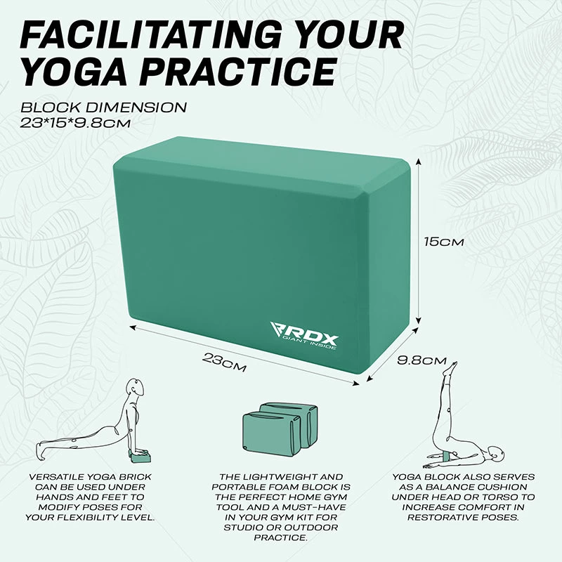 Made for beginner and intermediate yogis alike, this sturdy foam yoga block provides strong support for your bridge poses, and comfortable lift to perfect your alignment in the crescent moon stance. Add this optimally sized yoga block (23*15*9.8cm) to your home gym essential and yoga accessories for increased versatility in your practice. Cultivate healthy energy flow by bringing balance and alignment in your form and everyday life with the RDX EVA Foam yoga blocks.