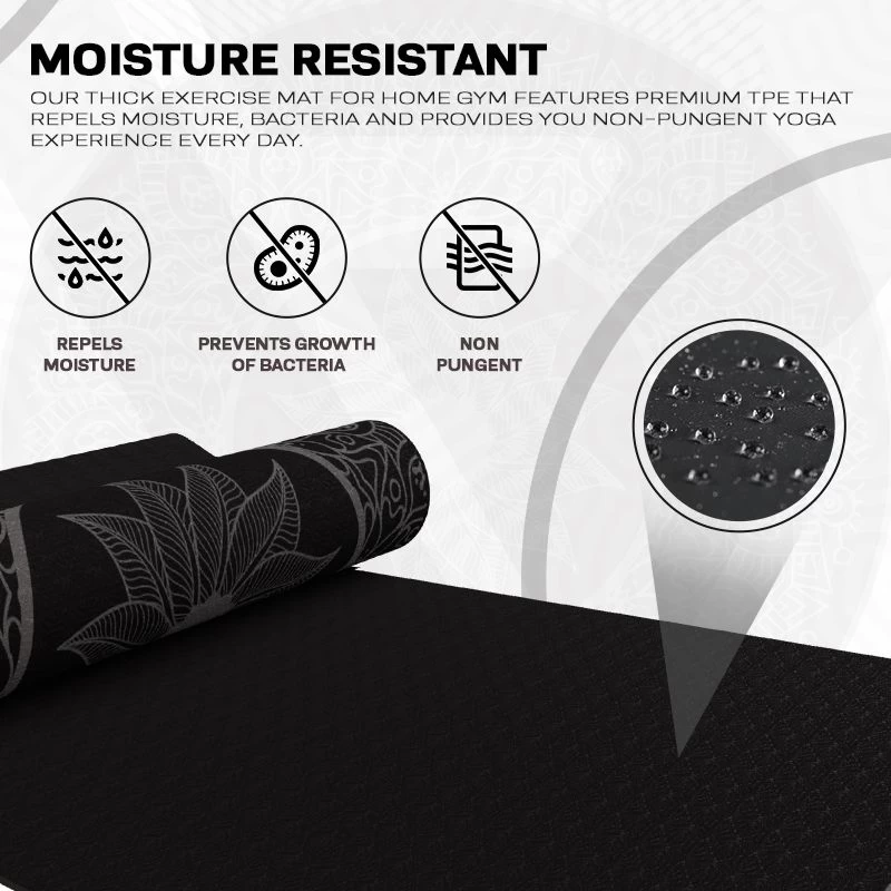 - MOISTURE RESISTANT- Our thick exercise mat for home gym features premium TPE that repels moisture, bacteria and provides you non-pungent yoga experience every day.