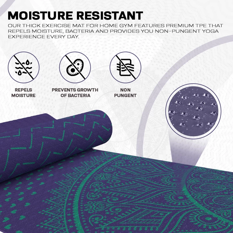 - MOISTURE RESISTANT- Our thick exercise mat for home gym features premium TPE that repels moisture, bacteria and provides you non-pungent yoga experience every day.