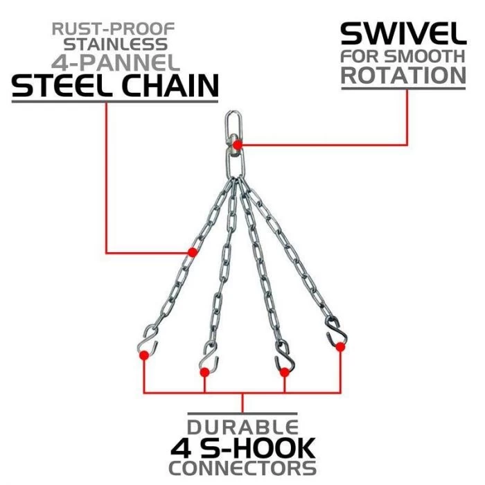 - 1 x Pair of Hand Wraps, 1 x Steel chains, 1 x Swivel, 1 x Jump rope, 1 x D-Shackle, 1 X Punch Bag Strap Hook,1 X Punching Bag Strap