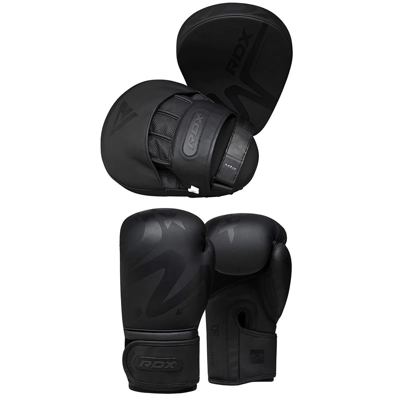 Make a statement with this RDX Noir boxing set. Noir boxing gloves paired with matching focus pads, both with unmatched shock absorbing tech in a mould purposed to maximize delivery and security. Unleash hell and look good doing it with this stylish handcrafted pair.