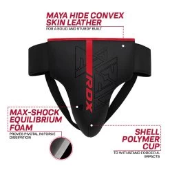 Catering to all your protective needs RDX brings you state of the art groin guard. Maya Hide convex skin leather padded with Max-ShockTM Equilibrium Foam on waistband makes the build lightweight without any compromise on durability. Equipped with a shell polymer cup that will not hinder your movement while imparting you with exemplary protection. Elasticated straps ensure a comfortable and customized fit. Expertly crafted stitching guarantees that material doesnt start ripping from the seams.