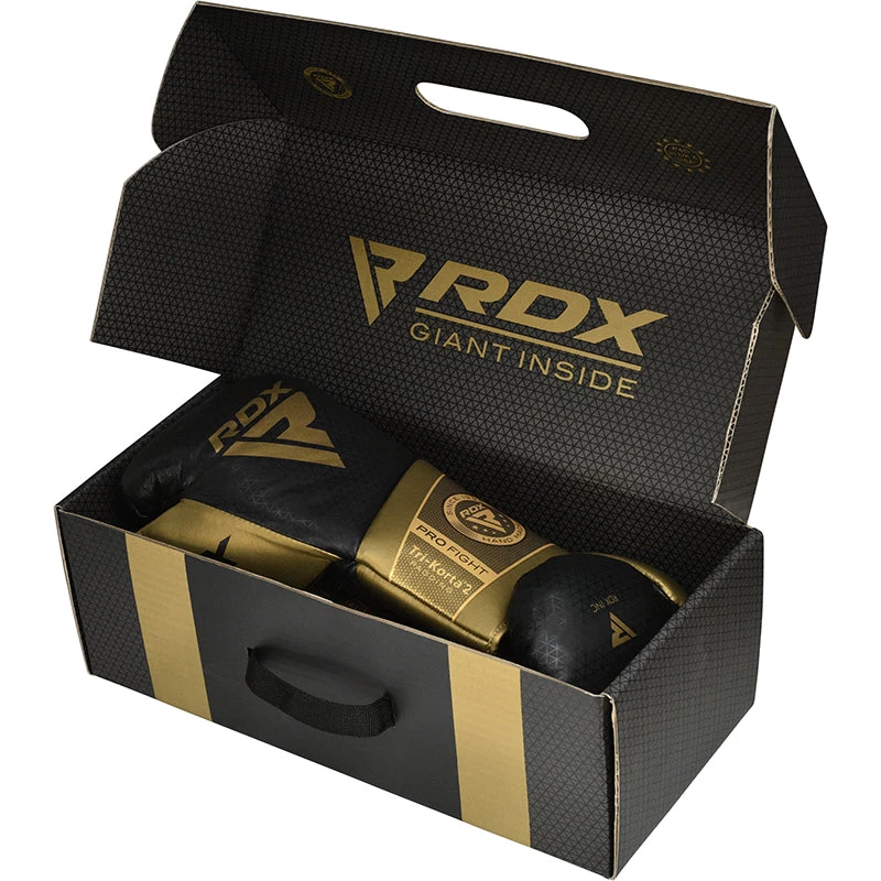 Put up your dukes! Prepare to manifest goals and take your combat sports career to new heights with RDXs Tri Korta 2 fight gloves. Resilient Super Skin leather with a breathable dazzle fabric inner stitched to perfection, results in a remarkably study pro boxing gloves which feel incredibly comfortable on the inside with the ideal fit to protect your fists. High density Tri Korta MOULD breaks down the shock-impact and is backed with Sponge X PADDING that further enhances shock-absorbency so you get the most comfortable power punching experience. Max-ShockTM Equilibrium Foam padding delivers proactive knuckle defence without sacrificing power and effectively dissipates impact across the surface of this competition glove. Our boxing glove in black and golden features a lace-up mechanism with Max-ShockTM Equilibrium Foam and Sponge X PADDING across the cuff for enhanced wrist-stabilization and wrist-protection from stray shots.