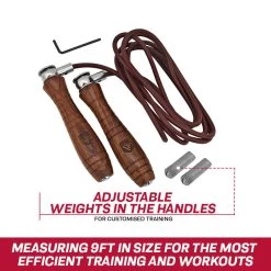 Raise your fitness game with our weighted 9ft skipping rope. Designed for boxing training, speed training and more. Changeable weights in the handles means that you can create a customised workout and made from super tough cowhide leather, this rope is built to withstand every kind of punishment. Additionally, the 90 degree perpendicular swivel ensures anti-traction skipping plus the wood designed handles offer a superior grip for the most effective training sessions.