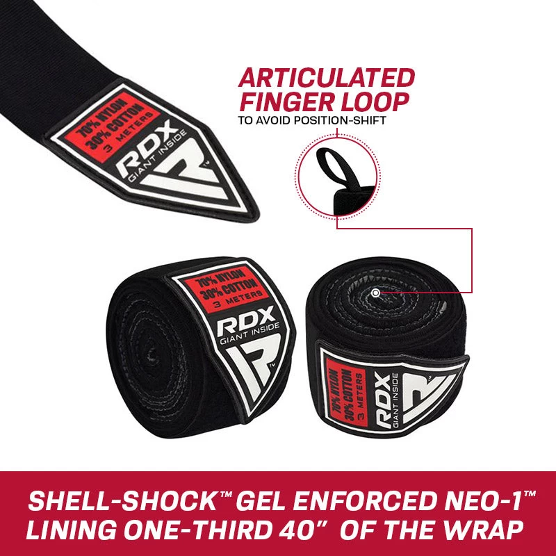 RDX GEL Tech hand wrap is 3-metre shock-resistant wrap which ensure extra protection to the hands. The wraps comes with Shell-Shock Gel enforced NEO-1 lining on 40-inch of the wrap while Ayz-F elastic lining on the rest of the 80-inch. The wrap comes with an articulated finger loop to avoid position shift while include Quick-Ez hook and loop closure to snug fit.