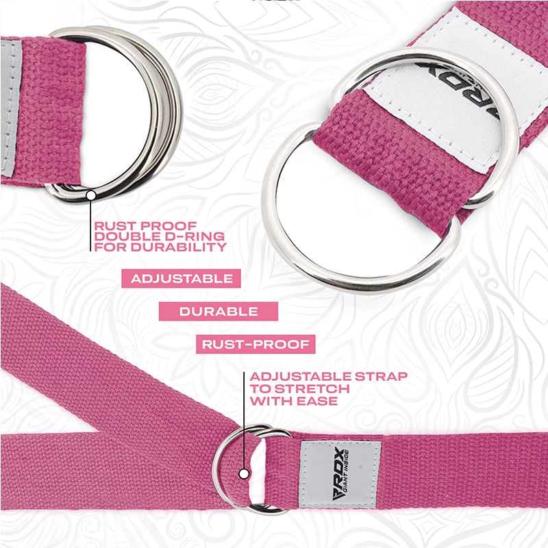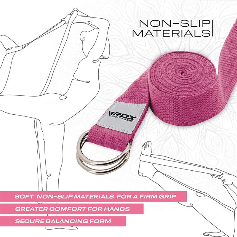 Bridge the gap between your current fitness workout and yoga goals with RDX’s eco-friendly Yoga Straps. Deepen your yoga practice and maximize your performance by challenging flexibility, strength and endurance with this versatile yoga accessory.Made from thick and sturdy premium poly-cotton that is sustainably sourced and holds firm to give you confidence for extending reach and improving mobility in more challenging poses. Our stretching strap is easy to use and simple enough to tie up for your use, allowing you to grab limbs that would be otherwise challenging. Adjustable 8ft long loop strap conforms to perfect alignment of shoulders and back, or stretch out muscles of legs and arms for unlimited yoga poses. Ideally endorsed with 3.8cm width and 0.13cm thickness, our yoga strap is perfect for physical therapy and rehabilitation, yoga exercises at home, Pilates or athletic warm-ups at the gym. Made with soft materials with adjustable double D rings which are rust-proof and unbreakable. A must-have in your yoga kit for studio practice or working out at your home gym. Our easily machine washable yoga stretch strap offers convenience of use and non-slip grip for sweaty hands during intense workouts. Capable of withstanding wear-and-tear from daily, vigorous routines. Comes with a carry bag and exercise manual so you won’t miss any workout day. Pick the colour that matches your style.