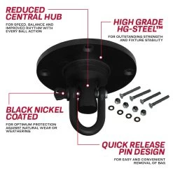 Coated in black nickel and constructed from the sturdiest high grade steel, this stylish speedball swivel is made to last a lifetime. Reinforced with industrial strength ball bearings, this is the ultimate speed bag hanger for pro gyms and boxing training institutes. Designed with low friction and a reduced core, athletes will benefit from the smooth rotation plus enhanced speed and movement with every hit. Finished off with a quick release feature, changing or removing the speedball for storage is easier than ever. Comes with all necessary fixings for easy installation.