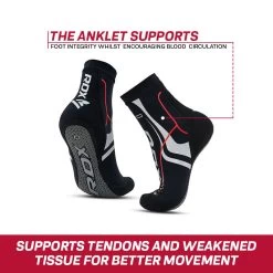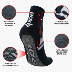 RDXs Neoprene Anklet Socks Brace Support with anatomical arch design will enhance your foot-work to another level. The socks incorporate compressed spandex monofilament coalesced elastic yarn lycra for improved fitting, grip on the matt and better foot-to-ankle form. The unique Grip Flex sole pattern ensures 0% slippage and allows maximum traction for you to move without worrying about stepping the wrong way, in-turn avoiding common training accidents like twisting of ankle or damaging the weaker tendons and bones of the feet. (SMALL & MEDIUM SIZES RECOMMENDED FOR UP TO 14 YEARS OF AGE)