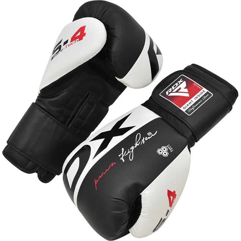 The RDX S4 boxing gloves are handmade with durable and authentic cowhide leather that will not batter easily. The cowhide outer is matched with a low-density membrane grid foam inner that densely pads the knuckles from the power of fist-meeting-face impact. The palm and wrists are protected with a thin but effective sheet of shock-absorbent gel that absorbs any excess force. The interior of the gloves is lined with antibacterial microfiber wicks that pulls the moisture away from the hands to keep them ventilated and cool. The new taka duo elastic hook-and-loop strap secures and supports the blows while keeping the wrist aligned with the hand for true-to-form punching stance. These gloves are also ideal for muay thai training and sparring with trainers and punching bags.WAKO Approved.