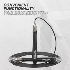 - WORKOUT GUIDE & ANTI-MICROBIAL POUCH RDX Aluminium jump ropes are portable and lightweight enough to carry anywhere in their own antimicrobial pouch. Use the included workout guide to try out different easy-to-learn workouts at your own pace. Available in striking red, blue, and black colors with a metallic finish to add more energy to your workouts.