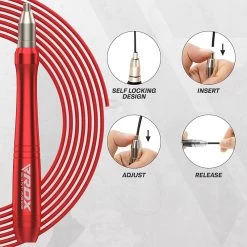 - SELF-LOCKING SYSTEM Our Aluminium speed skipping ropes come with a unique self-locking design, so when the 10.3 ft. cable is being adjusted the cable locks into place instantly, eliminating the need of cutting excess wire. It facilitates easy adjustment for users of different heights.