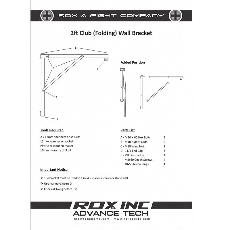 Similar to the 3ft wall-bracket Advanced Tech Series, RDX®s 2FT foldable heavy-bag wall mount bracket is a smaller version, but even sturdier. Fold bracket without removing bag. Protruding arm stretches out 63CM away from wall, allowing for easy movement around heavy-bag. 38.5CM reinforced constitution with heavy-duty steel gauge tripod holds up to 70KGS, providing added support. Boxed set includes D-Shackle, assembly instructions and all necessary wall fittings needed for brick or block walls.